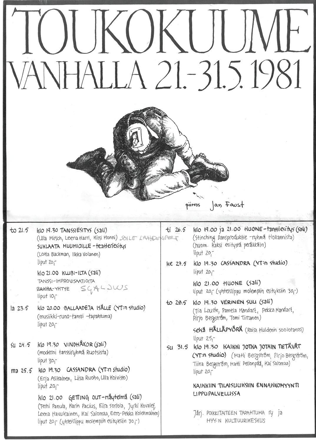 Vanhalla alkaneeseen Touko-kuumeeseen osallistuu viitisenkymmentä vapaaehtoista esiintyjää ja järjestäjää. Kuumeen teatteriosuuden aloitti Ilkka Volasen ja Ida-Lotta Backmanin Suklaata muumioille, kokeellinen esitys.
