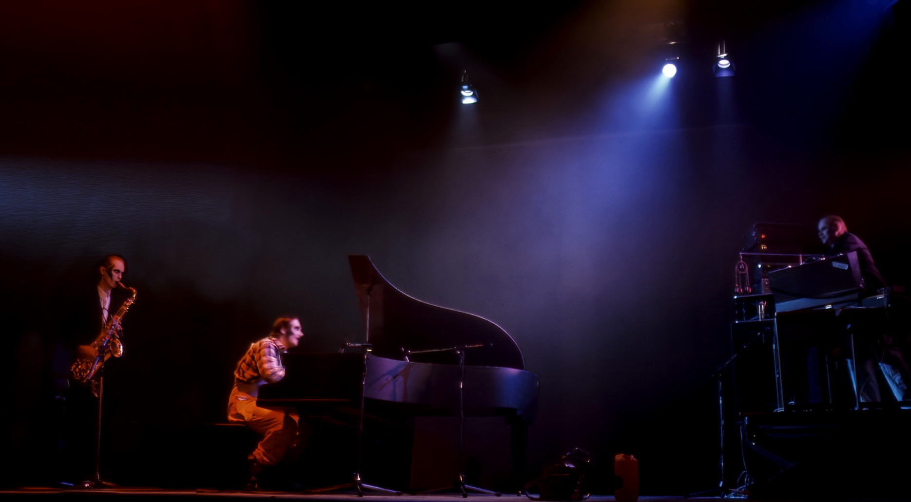 … 30-luvun Berliinistä heijastuva atavistinen perusdekadenssi oli tyylikeinona myös vanhassa jatsimusiikissa, jota viulisti Ahti Marja-Aho ja Houseband soittivat. Turhuutta kuvasti soolo silitysraudalla ja teryleenihousuilla. Musiikilliseksi huipentumaksi oli tarkoitettu Grand Final -teos jäähyväiset vanhalle, jossa flyygelin sahaamista säestettiin syntetisaattorilla ja saksofonilla. Lopullinen moottorisahaus jäi tietenkin toteuttamatta, ja rautaesirippu laskeutui kahden tyhjyyden väliin. Paikalla olivat kaikki nuorallatanssijat, voimamiehet ja nauruihmiset. Esitys ei kuitenkaan pyrkinyt olemaan perinteisin kriteerein arvioitavaa teatteria vaan kokemisen aste oli kunkin omasta luovuudesta kiinni. Jos halusi saada symbolikaaoksesta ja hulluudesta olennaisinta irti, piti heittäytyä rohkeasti sekaan. Näinhän se on elämänkin suhteen.
