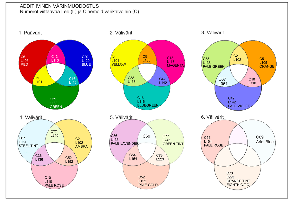 Menikö vaikeaksi? Eli additiivisten värien yhdistelmät tukevat toisiaan, synnyttävät toisiaan ja menevät aina kohti valkoista.