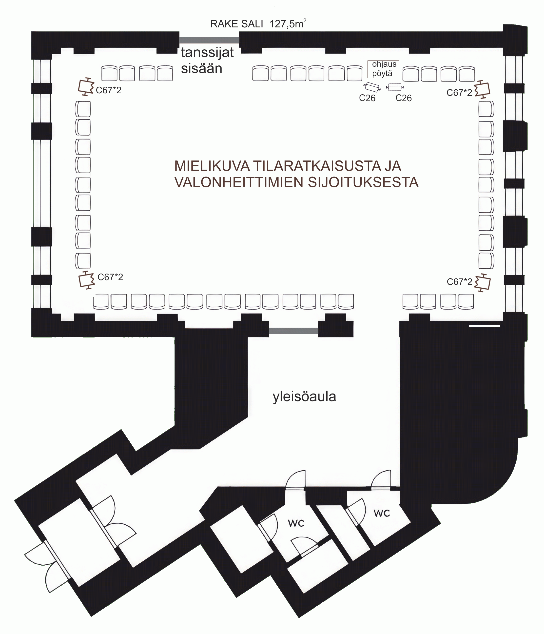 Oli pöheää mennä uuteen tilaan. Seistä näyttämöllä ja naputella tilan mitat ja valokaluston määrän ja painaa Enter. Pienen odottelun